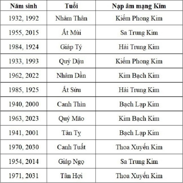 Gia chủ mệnh Kim sẽ sinh vào những năm kể trên bảng trên